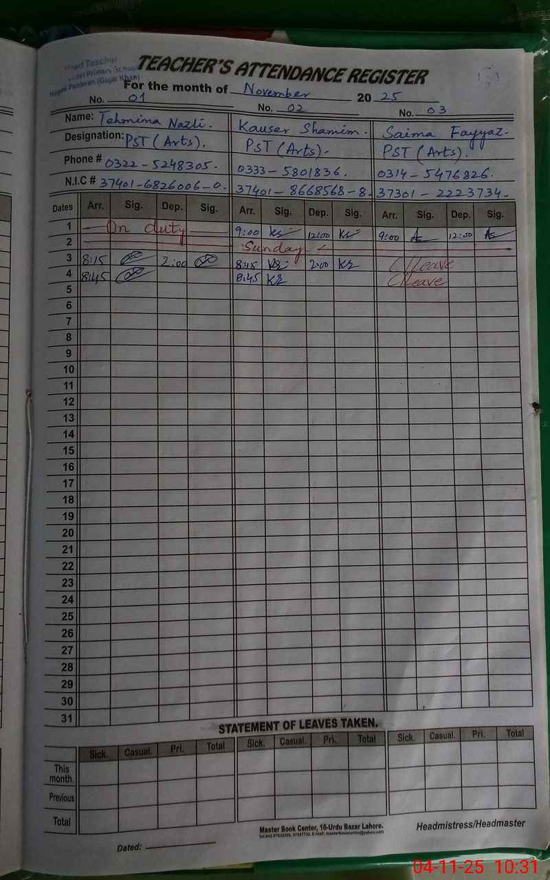 | CNIC | Full Name | Designation | R/C | Absence During Last Calender Month |