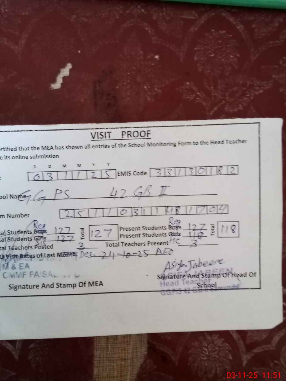 | Attendance Register | Head Teacher | MEA with School | Visit Proof |