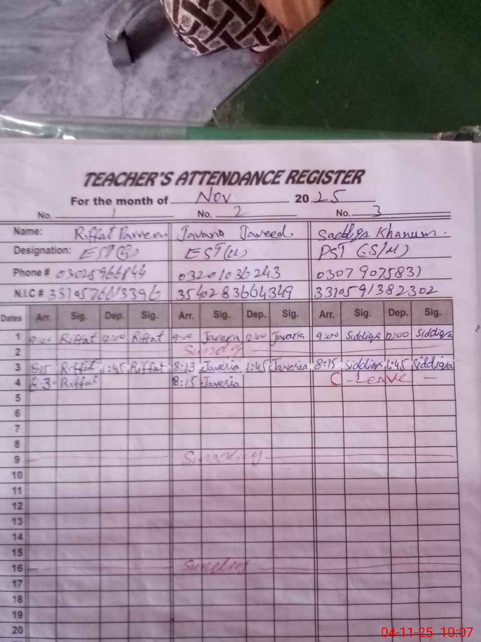 | CNIC | Full Name | Designation | R/C | Absence During Last Calender Month |