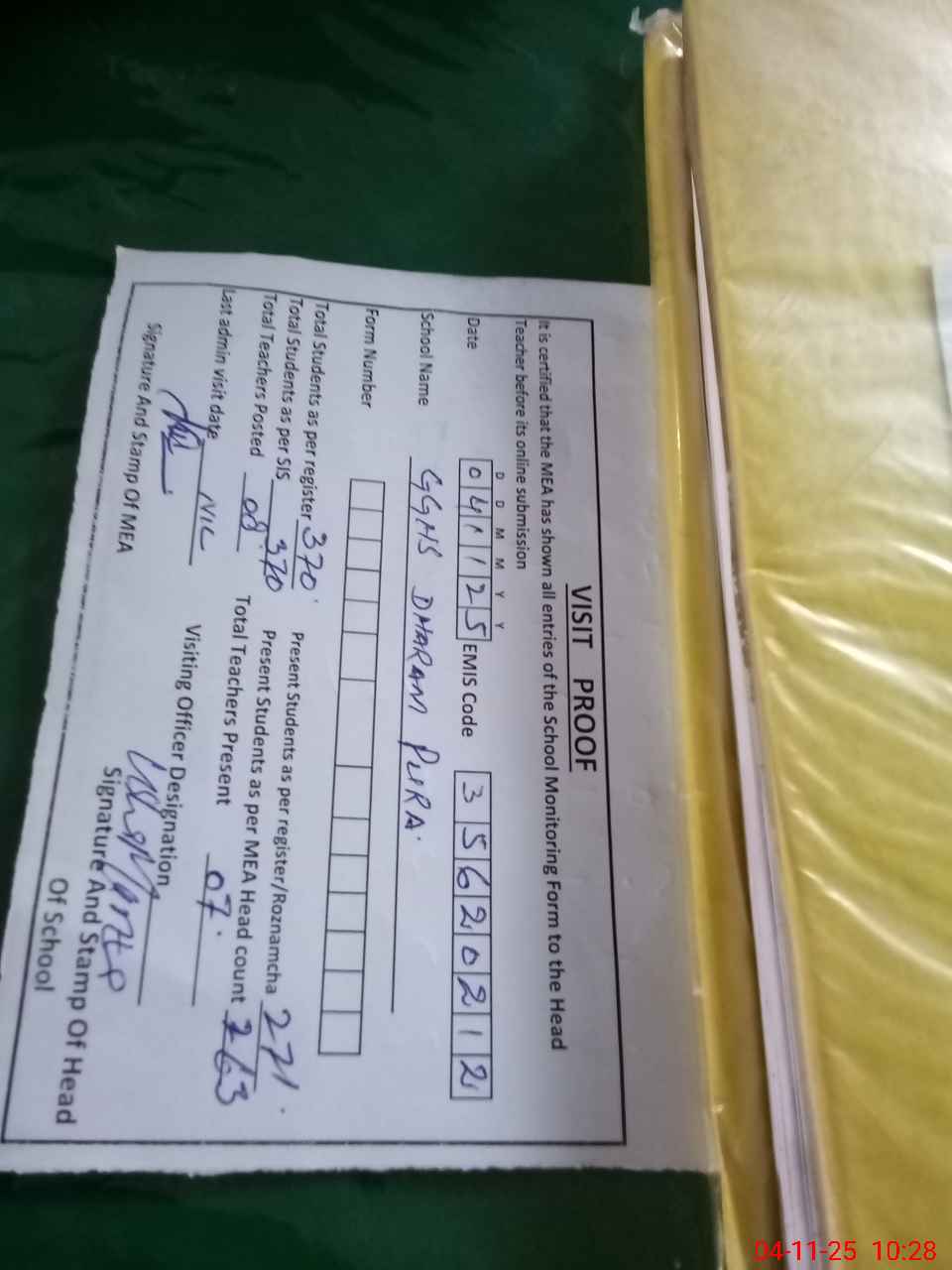 | Attendance Register | Head Teacher | MEA with School | Visit Proof |