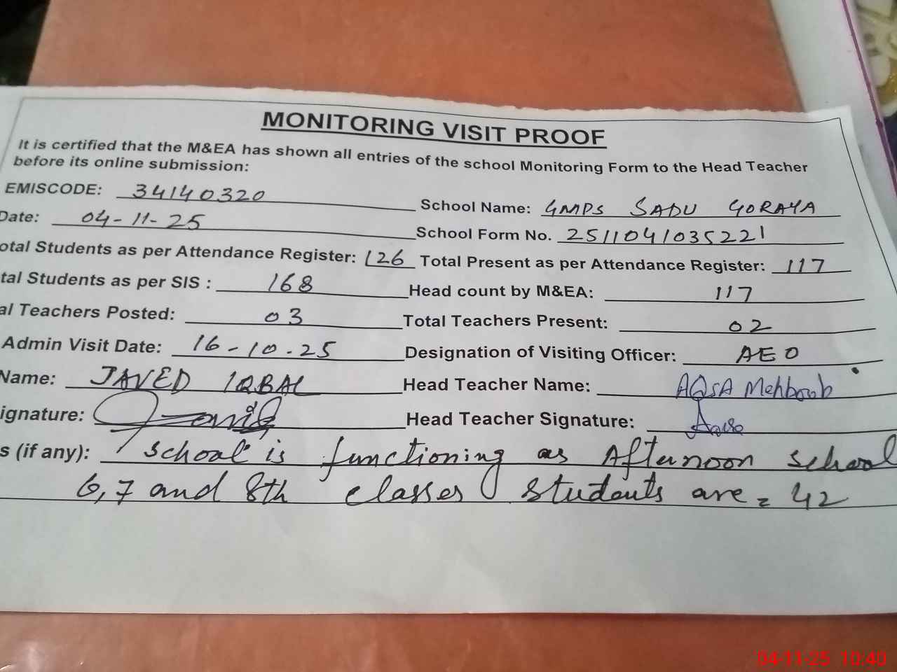 | Attendance Register | Head Teacher | MEA with School | Visit Proof |