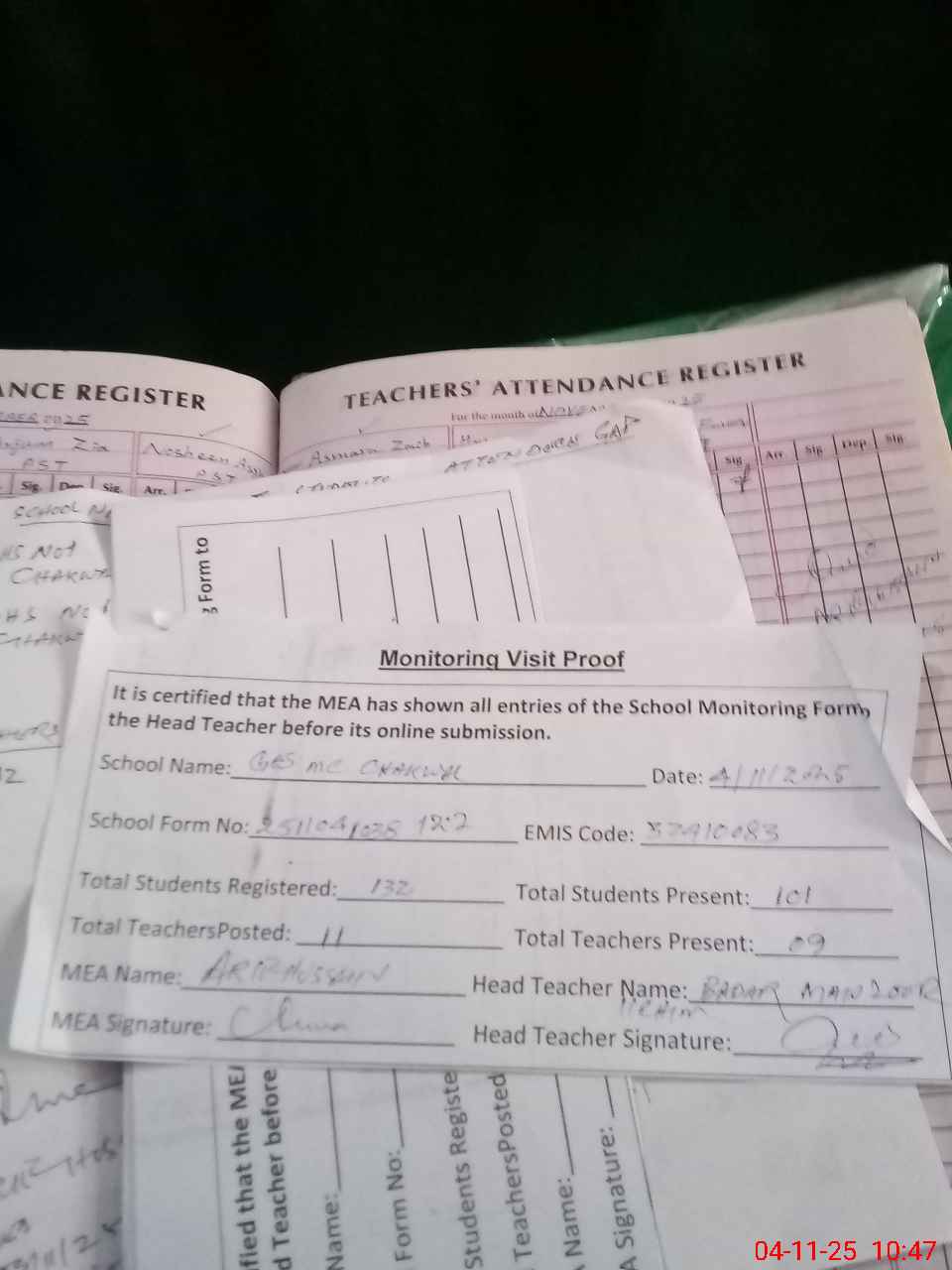 | Attendance Register | Head Teacher | MEA with School | Visit Proof |