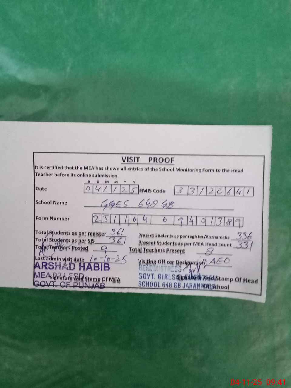 | Attendance Register | Head Teacher | MEA with School | Visit Proof |