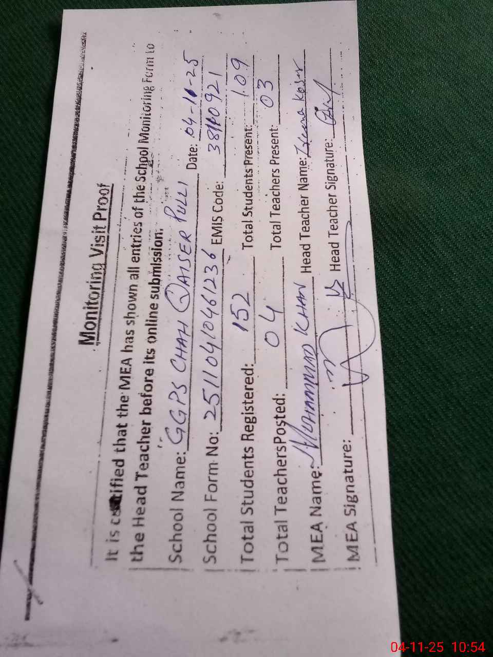 | Monitoring Date: 04-11-2025 | Start Time: 04-11-2025 10:21 AM | End Time: 04-11-2025 10:55 AM | Name of MEA: Mu**** Kh**** | |
