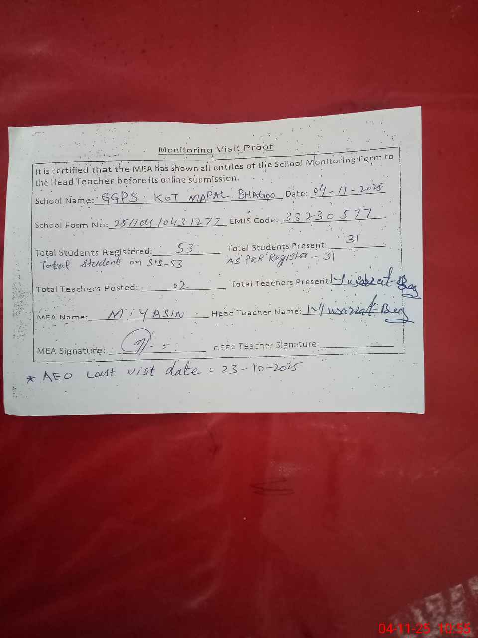 | EMIS Code: 33230577 | Name of School: GGPS KOT MAPAL BHANGOO | |||