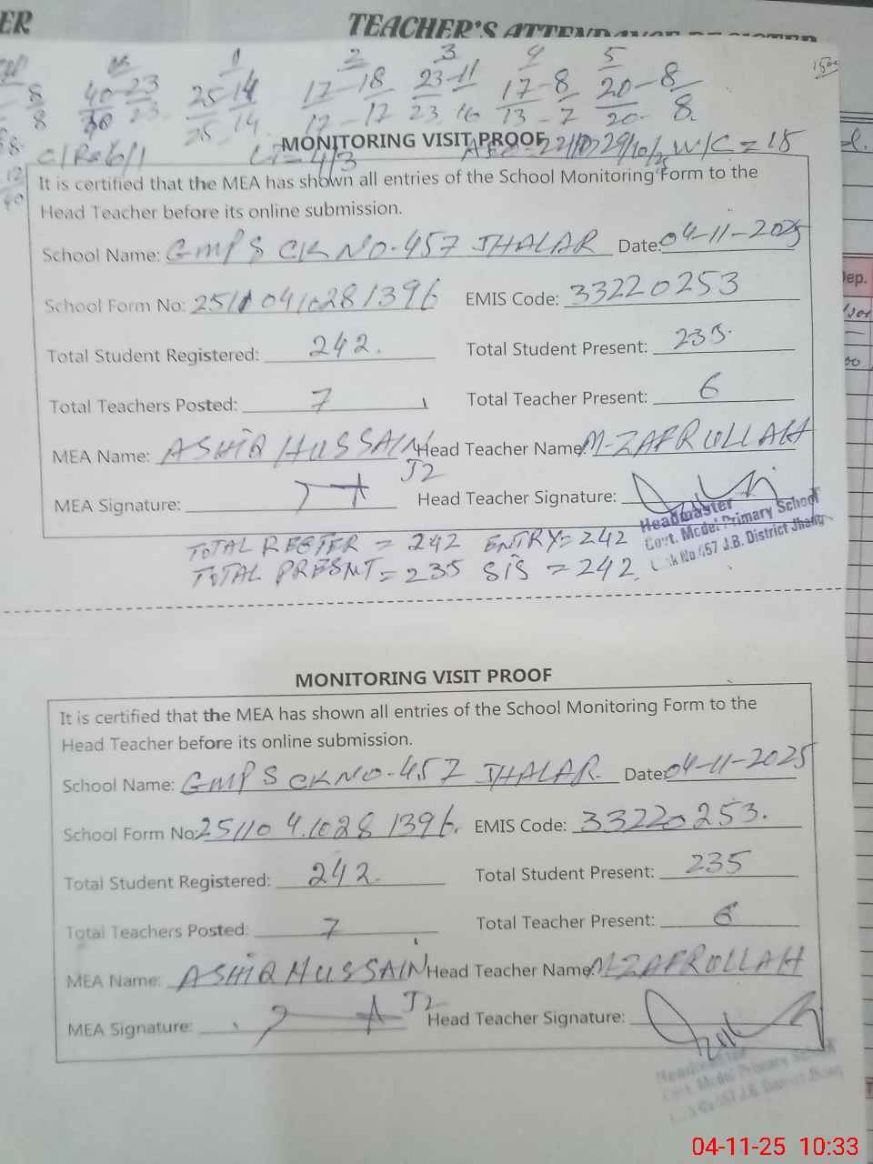 | Attendance Register | Head Teacher | MEA with School | Visit Proof |