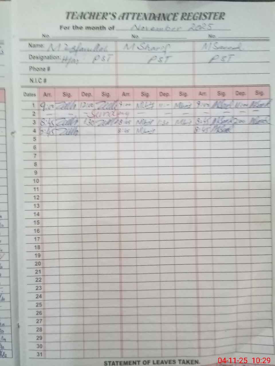 | CNIC | Full Name | Designation | R/C | Absence During Last Calender Month |