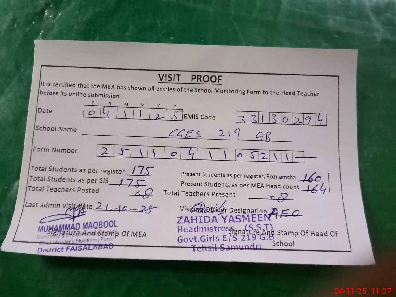 | Attendance Register | Head Teacher | MEA with School | Visit Proof |