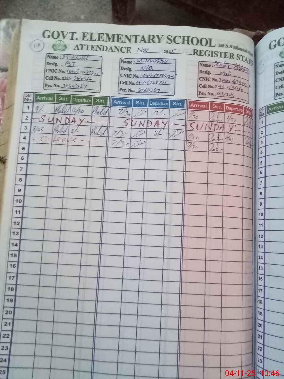 | CNIC | Full Name | Designation | R/C | Absence during last cal. month |
