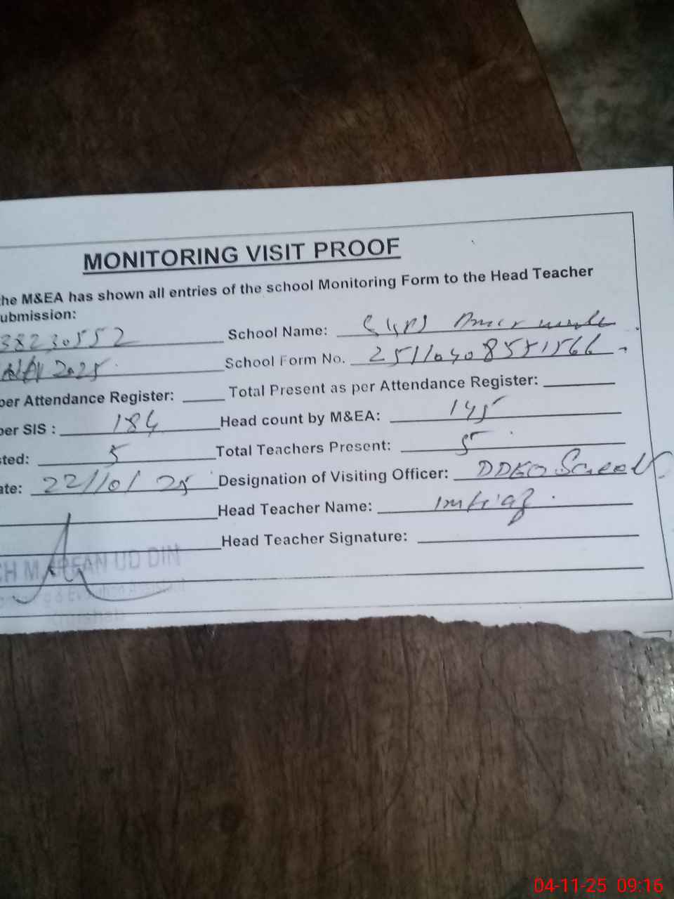 | Remarks (Use Separate Page if Required): Ggps amir wala Student on sis 184 Student on register 187 Head count 145 No teacher absent Last visit DEO Saeed 22 oct | |||||
