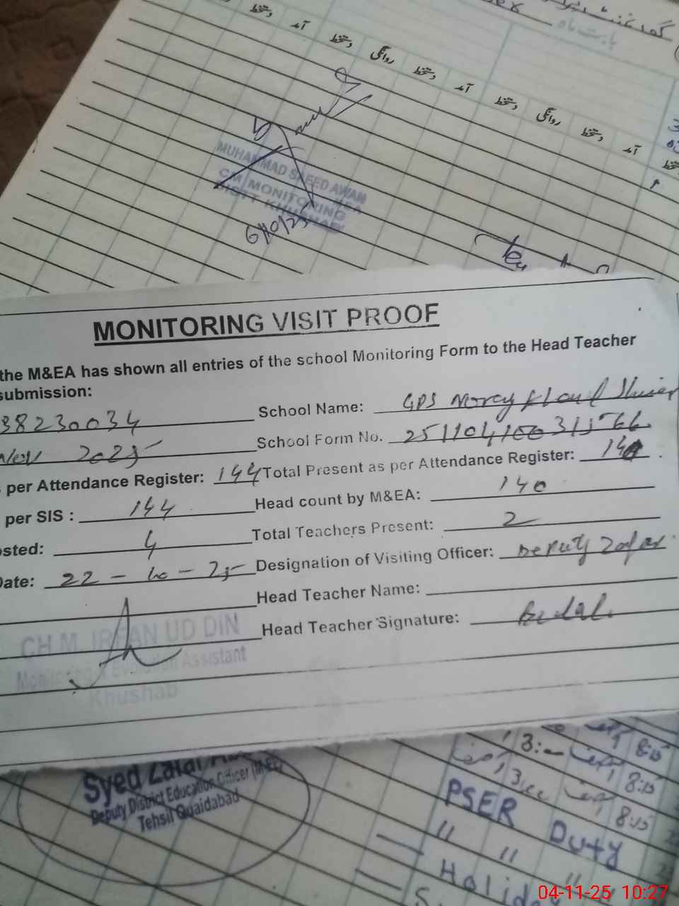 | Attendance Register | Head Teacher | MEA with School | Visit Proof |