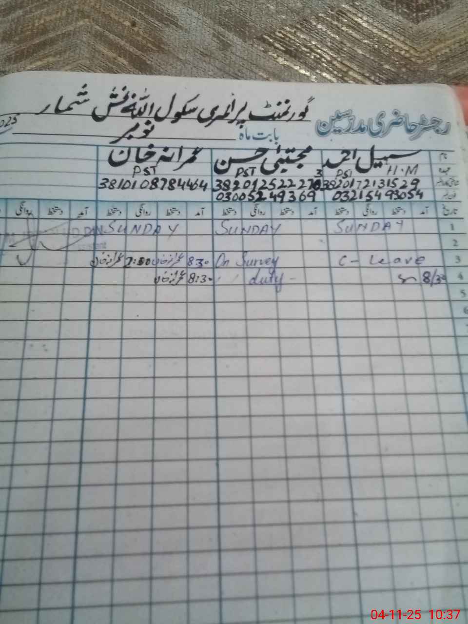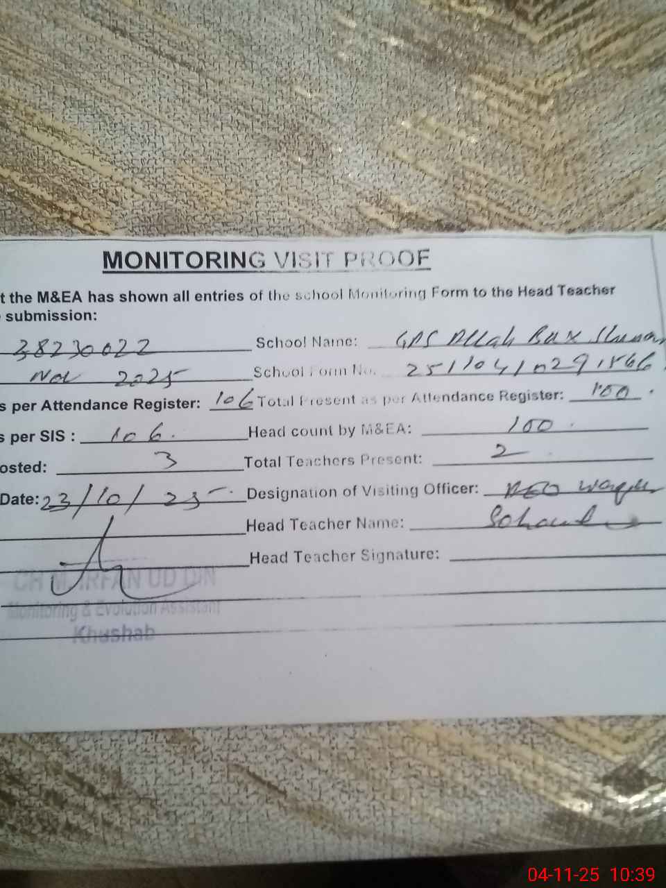 | Remarks (Use Separate Page if Required): Gps Allah bux shumar Student on sis 106 Student on register 106 Head count 100 No teacher absent Last visit 23 Oct 36 seats not available for students Class rooms required Teacher required | |||||