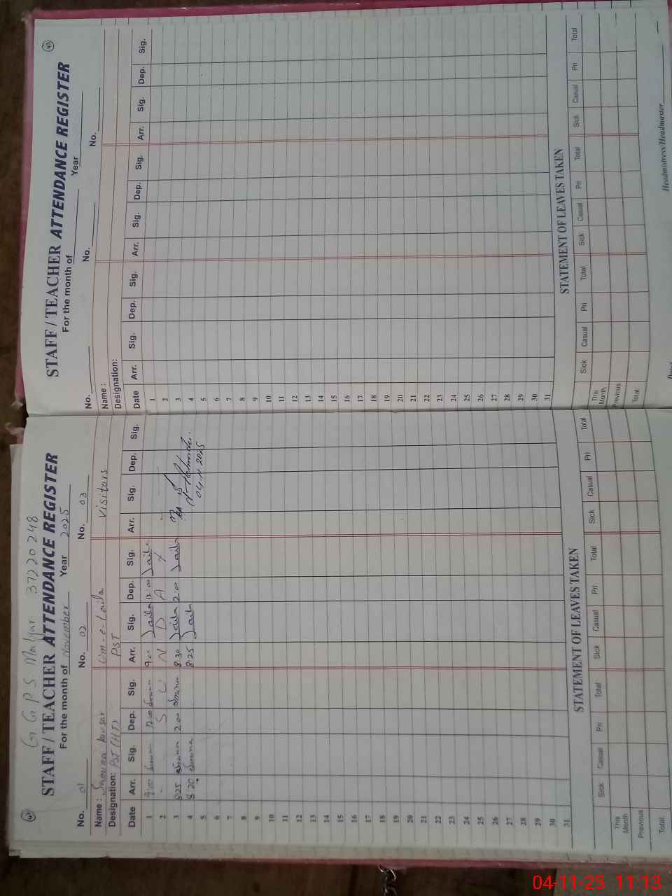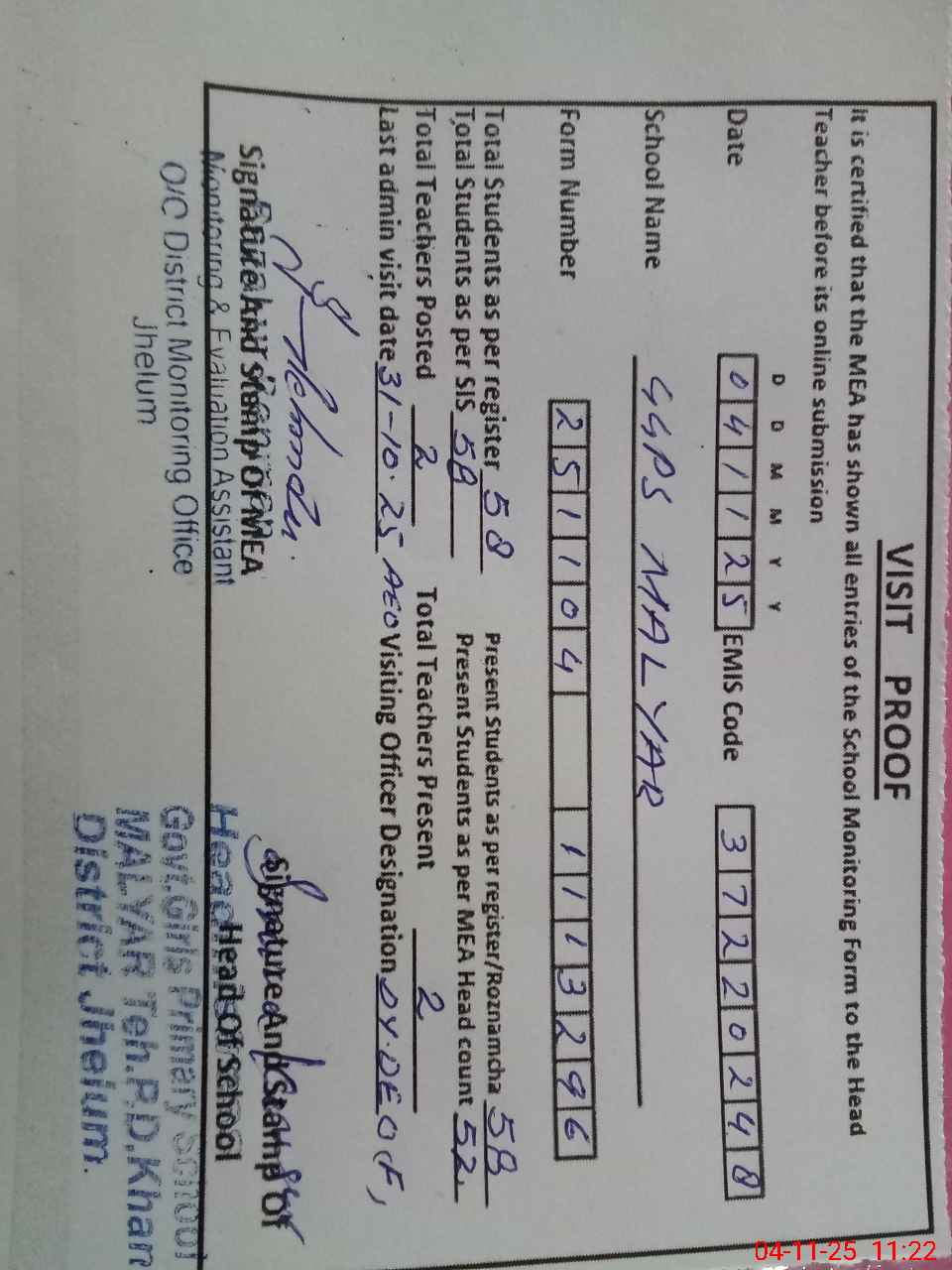 | Attendance Register | Head Teacher | MEA with School | Visit Proof |