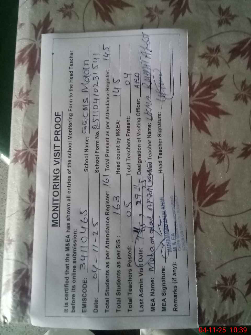 | Attendance Register | Head Teacher | MEA with School | Visit Proof |