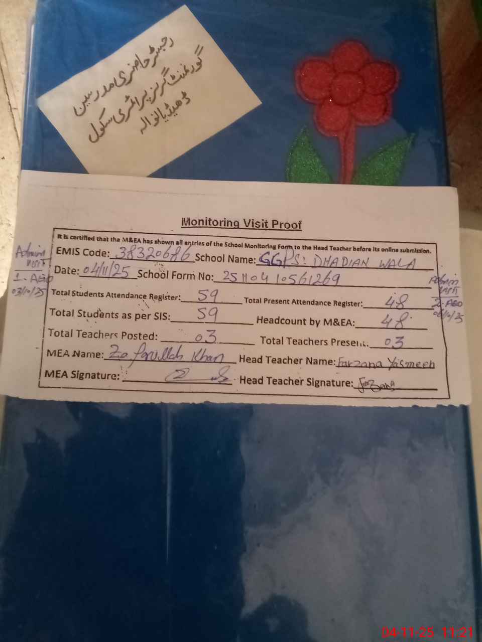 | EMIS Code: 38320686 | Name of School: GGPS DHADIAN WALA | |||