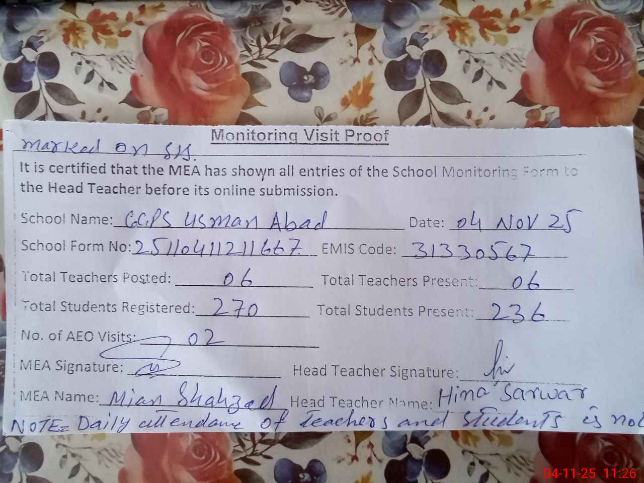 | Attendance Register | Head Teacher | MEA with School | Visit Proof |