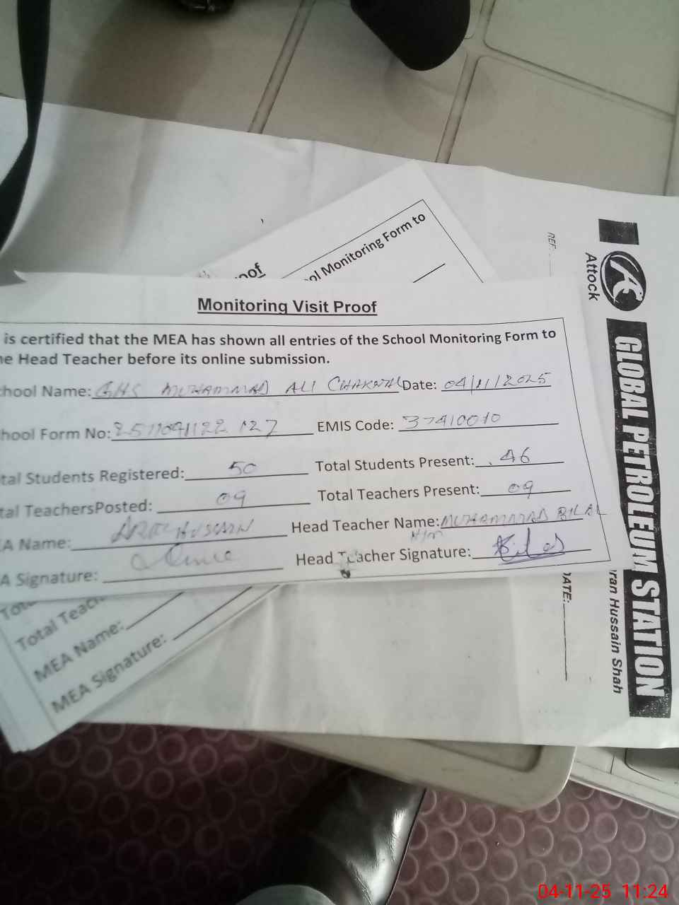 | Attendance Register | Head Teacher | MEA with School | Visit Proof |
