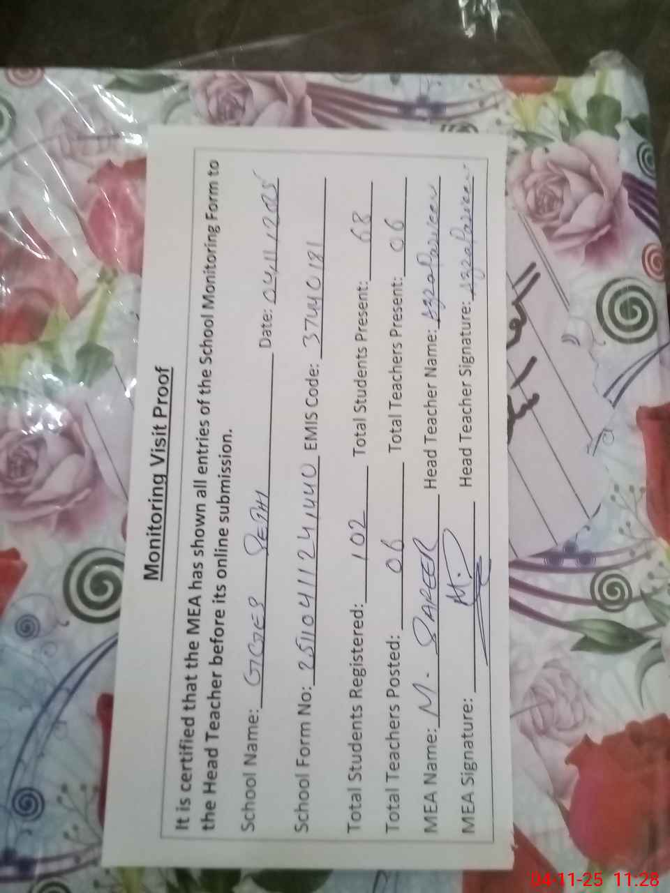 | Attendance Register | Head Teacher | MEA with School | Visit Proof |