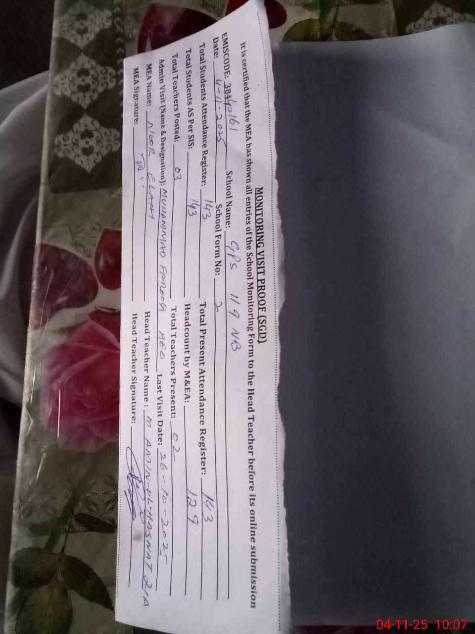 | Attendance Register | Head Teacher | MEA with School | Visit Proof |