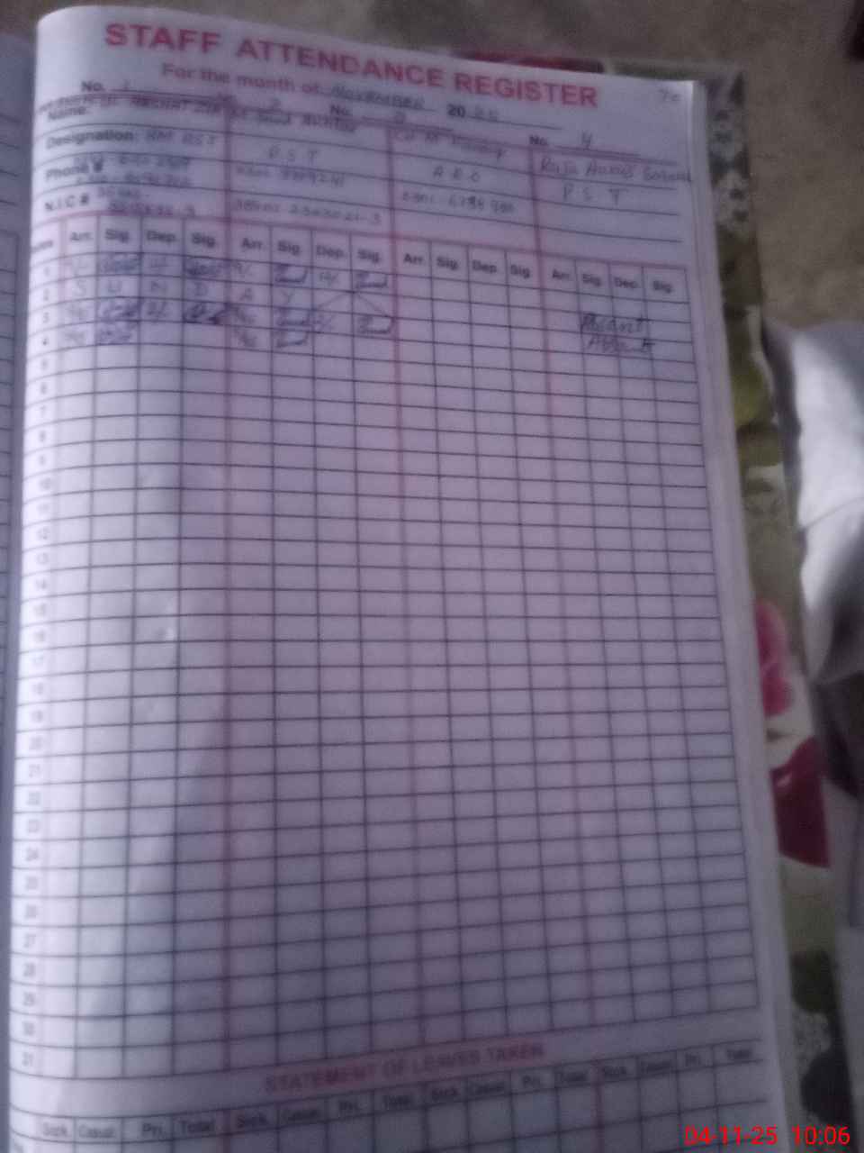 | CNIC | Full Name | Designation | R/C | Absence During Last Calender Month |