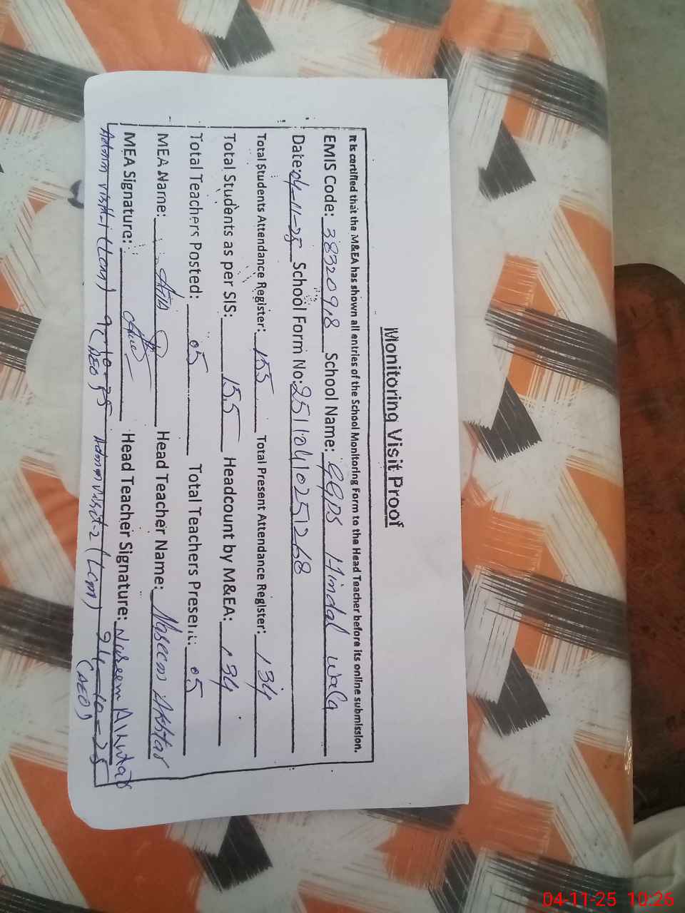 | Attendance Register | Head Teacher | MEA with School | Visit Proof |