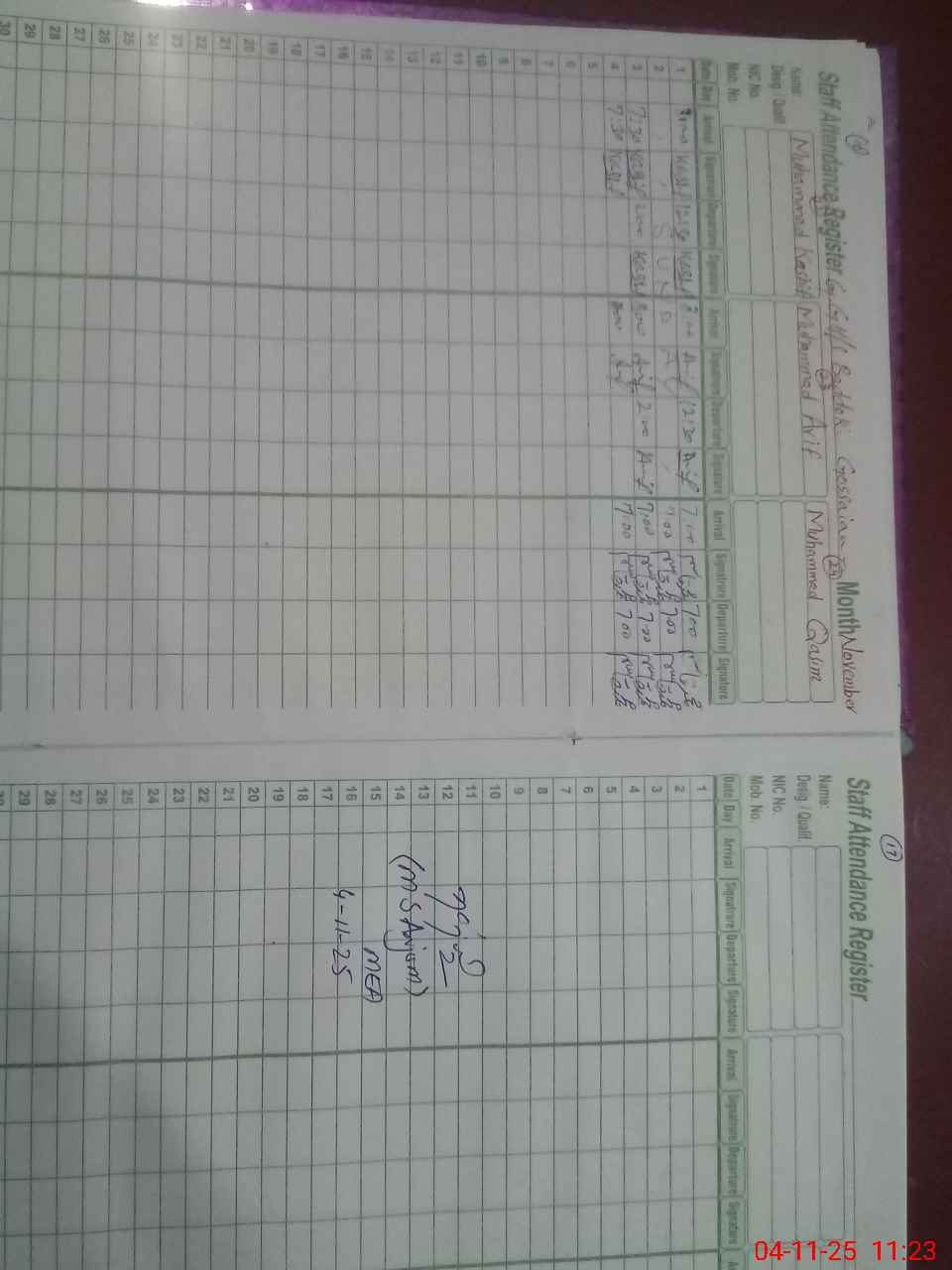| CNIC | Full Name | Designation | R/C | Absence During Last Calender Month |