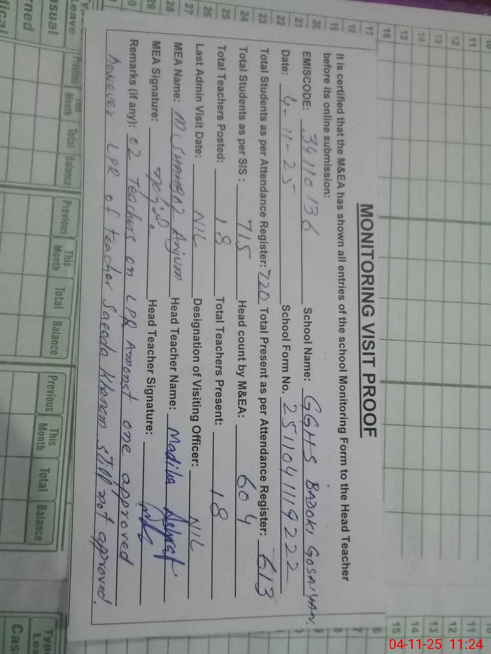 | Attendance Register | Head Teacher | MEA with School | Visit Proof |