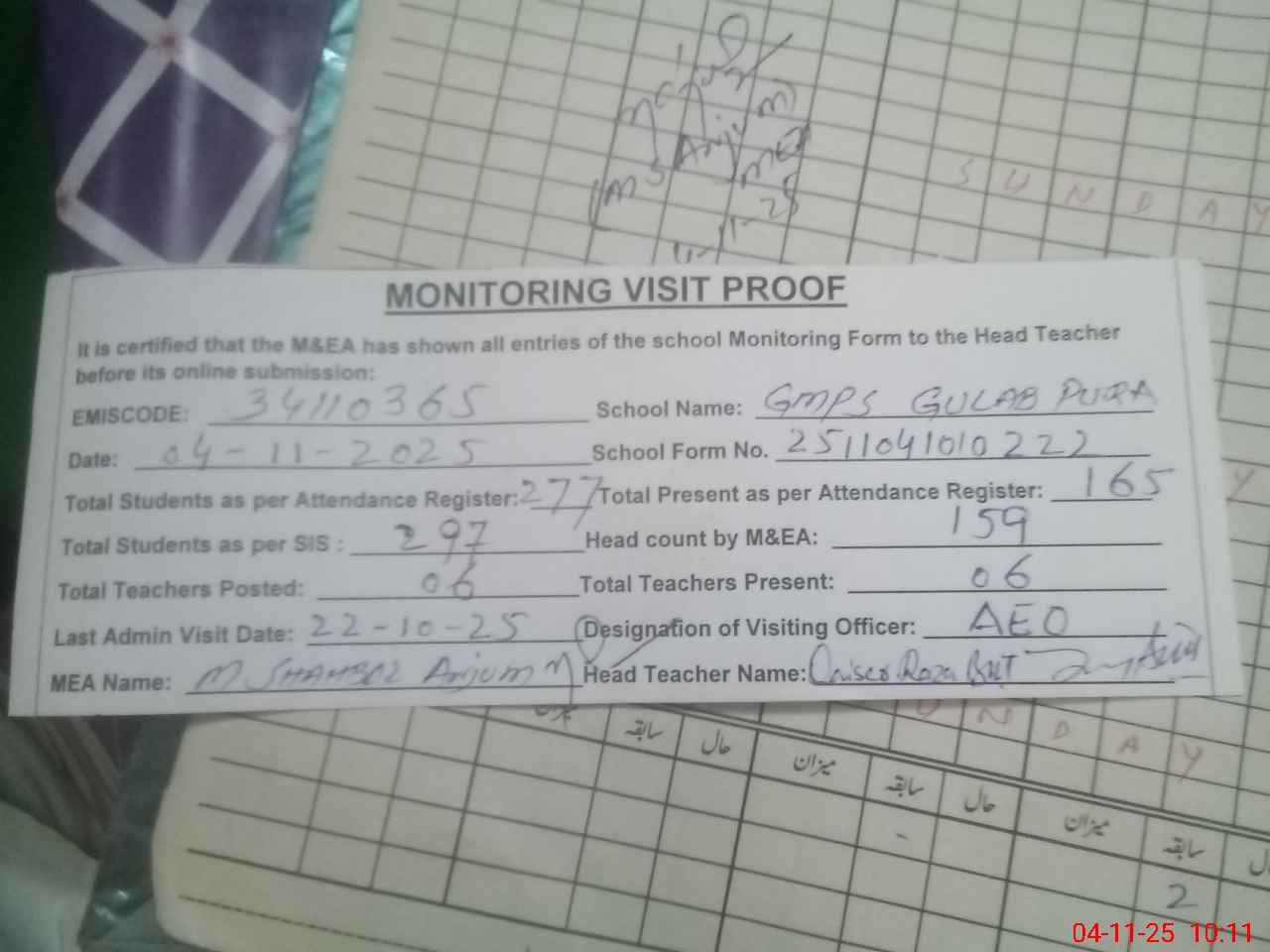 | Attendance Register | Head Teacher | MEA with School | Visit Proof |
