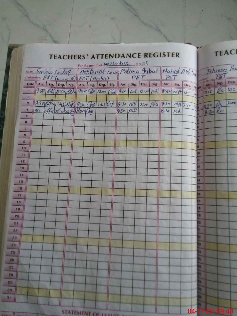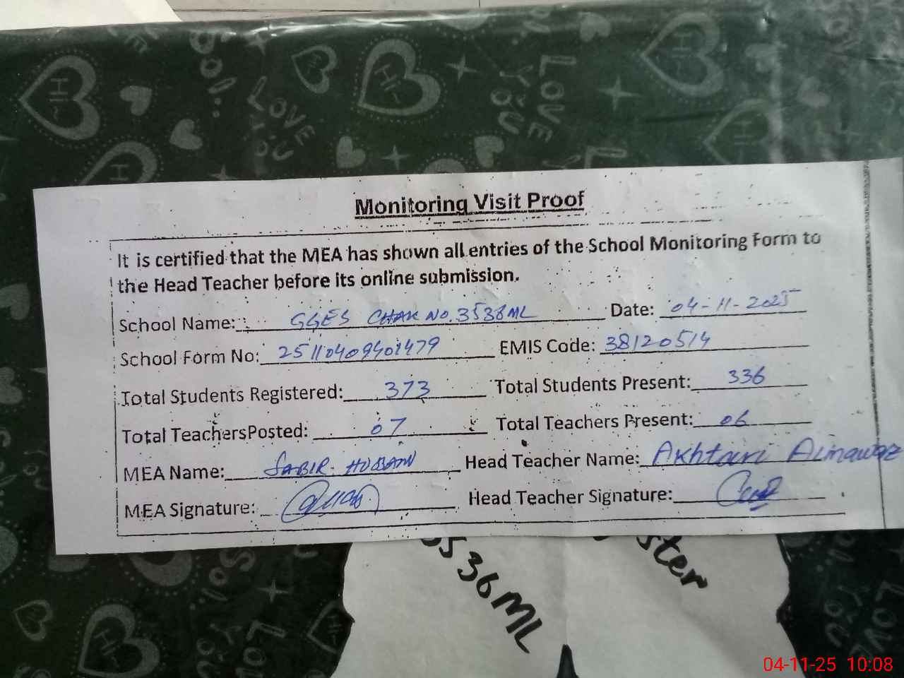 | Remarks (Use Separate Page if Required): Last visit by AEO ZAHRA SAFDAR on 27 10 2025 NSB and FTF record was not available in school No books record | |||||