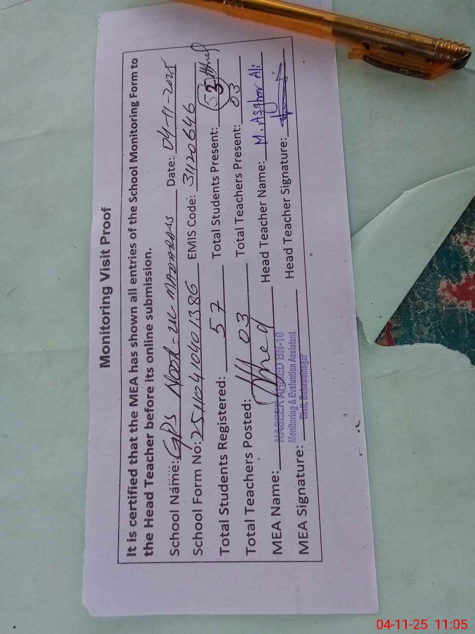 | EMIS Code: 31120646 | Name of School: GPS NOOR UL MADARSS | |||
