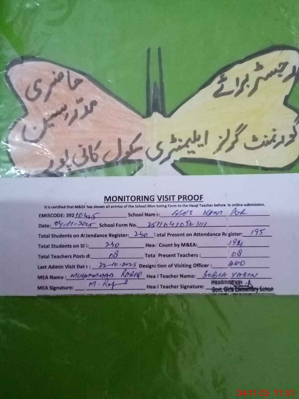 | Attendance Register | Head Teacher | MEA with School | Visit Proof |