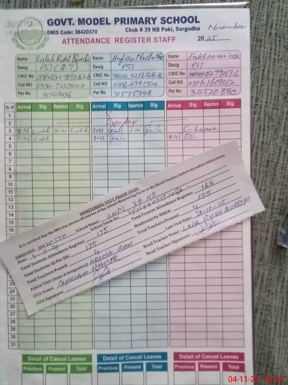 | CNIC | Full Name | Designation | R/C | Absence During Last Calender Month |