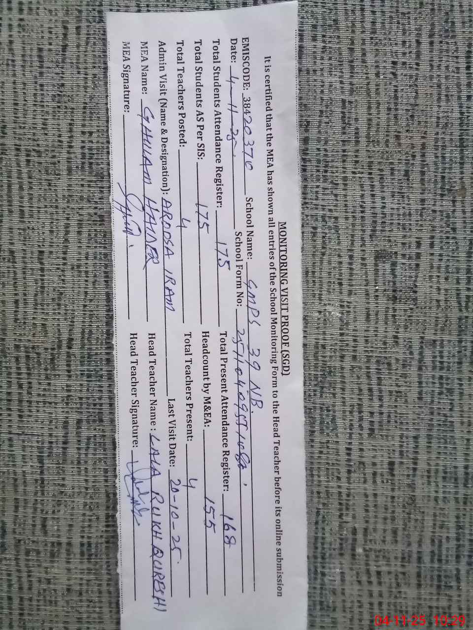 | Monitoring Date: 04-11-2025 | Start Time: 04-11-2025 09:55 AM | End Time: 04-11-2025 10:38 AM | Name of MEA: GH**** HA**** | |
