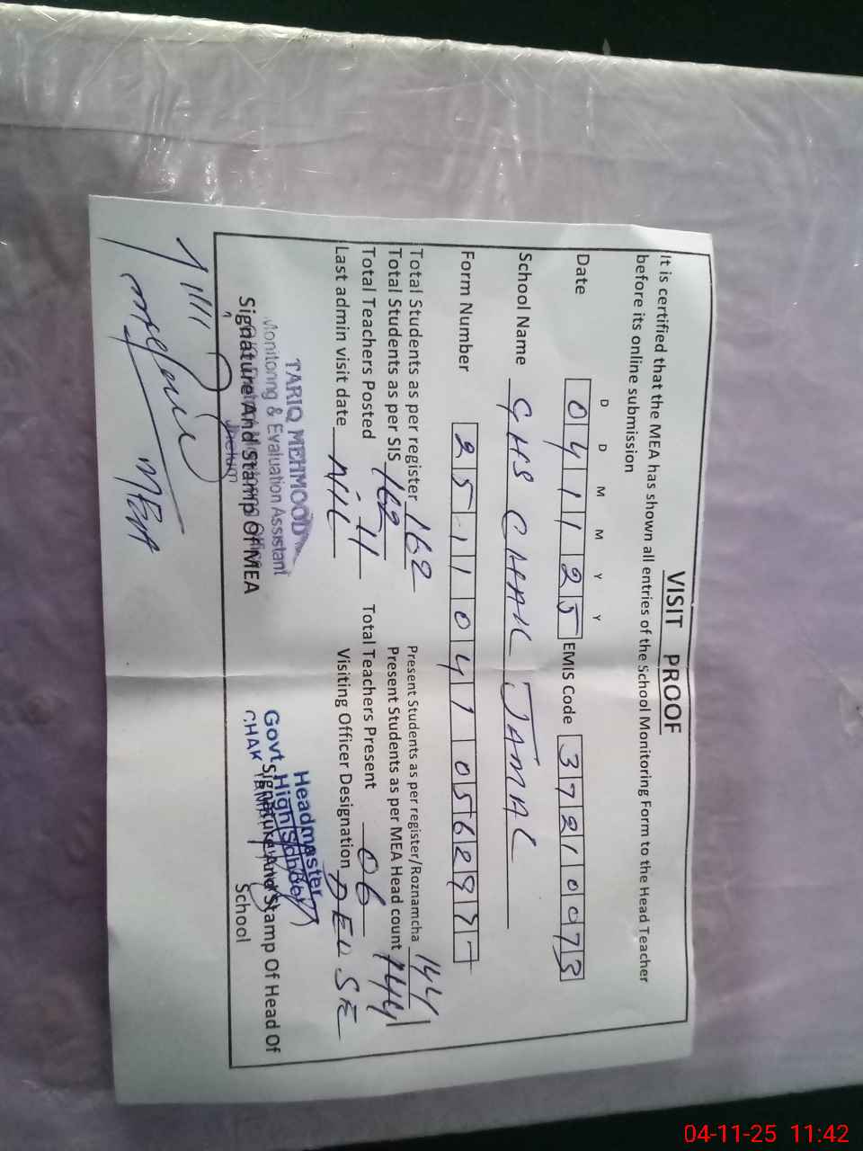 | Attendance Register | Head Teacher | MEA with School | Visit Proof |