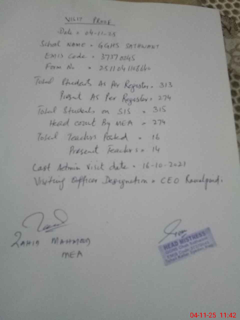 | Attendance Register | Head Teacher | MEA with School | Visit Proof |