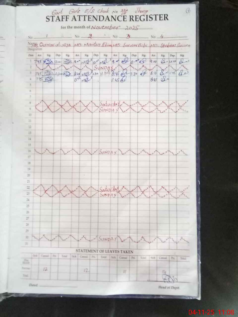 | No. of Students Present - Female | 17 | 0 | 31 | 31 | 32 | 15 | 25 | 21 | 35 | 23 | 26 | 256 | ||||