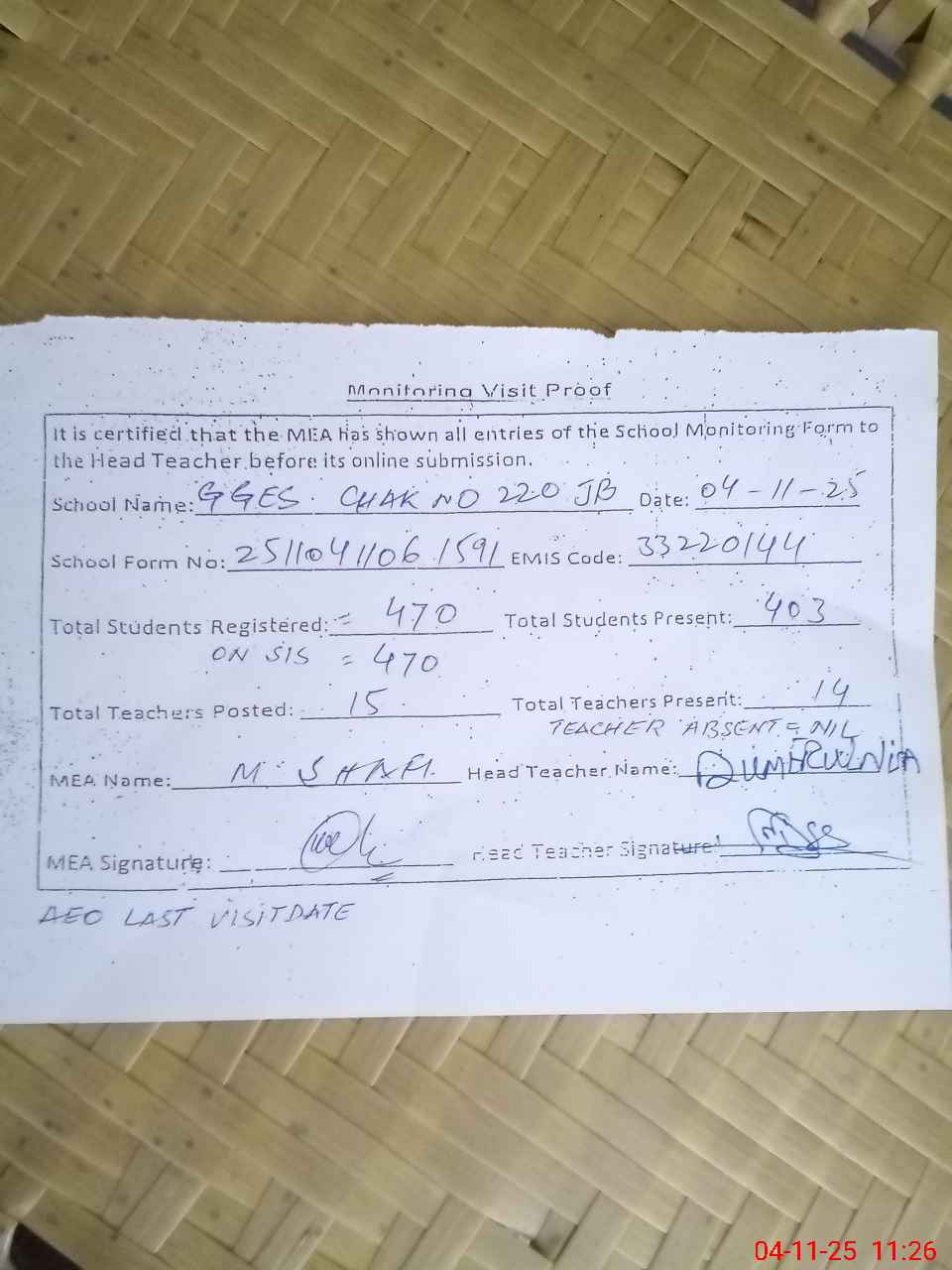 | Attendance Register | Head Teacher | MEA with School | Visit Proof |