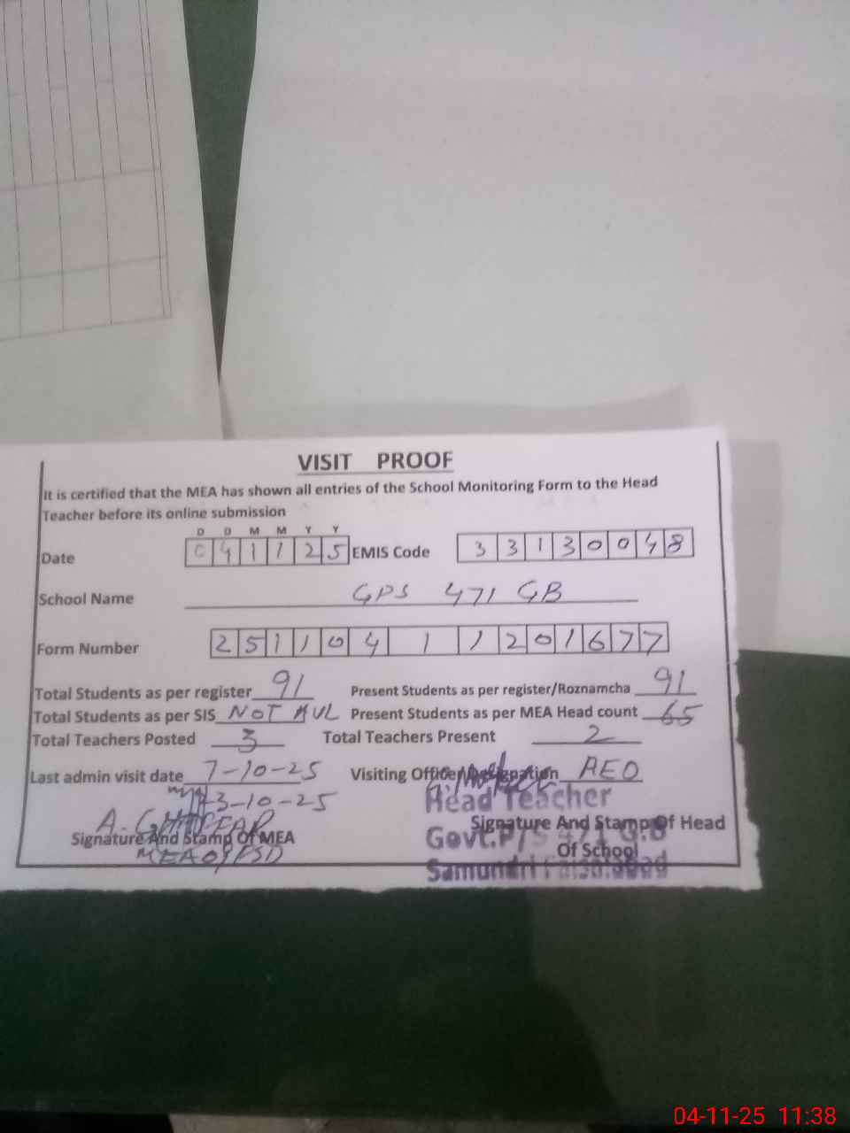 | Attendance Register | Head Teacher | MEA with School | Visit Proof |