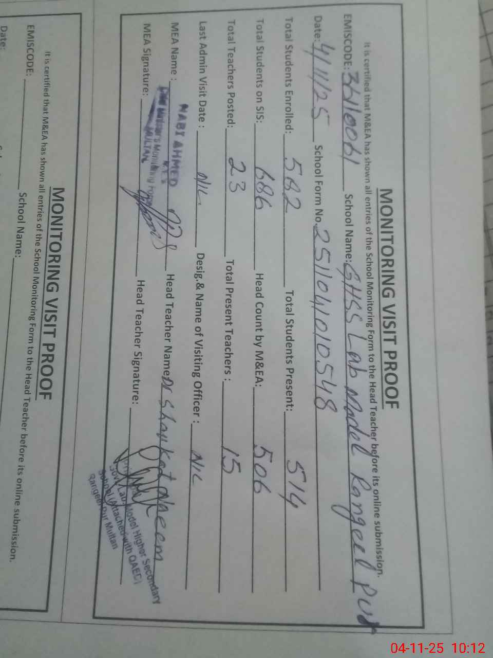 | EMIS Code: 36110061 | Name of School: GHSS LAB. MODEL (ATTACH WITH GCET) RANGEEL PUR | |||
