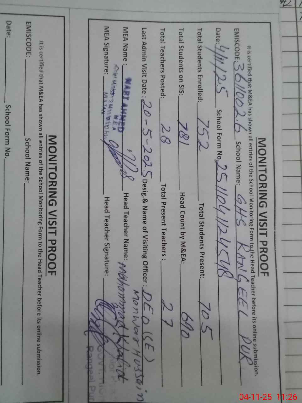 | EMIS Code: 36110026 | Name of School: GHS RANGEEL PUR SURAJ KUND ROAD MULTAN | |||
