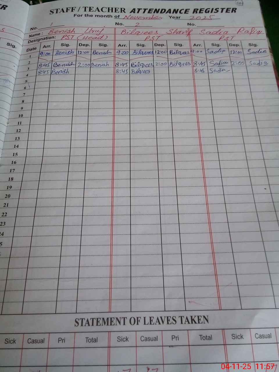 | CNIC | Full Name | Designation | R/C | Absence During Last Calender Month |