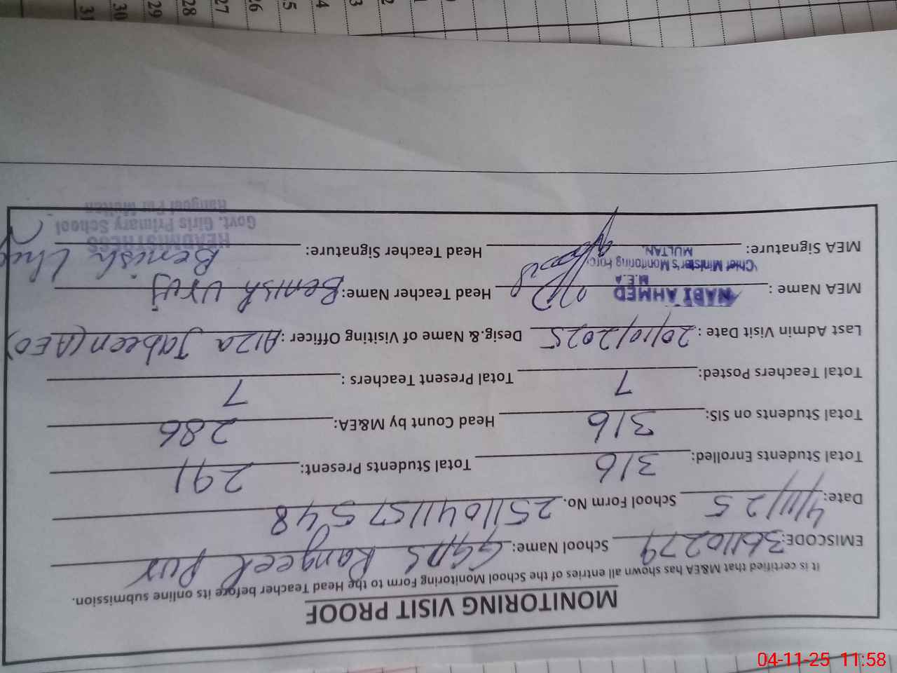 | Attendance Register | Head Teacher | MEA with School | Visit Proof |