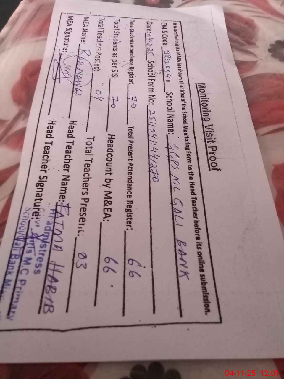 | EMIS Code: 38320540 | Name of School: GGPS MC GALI BANK | |||