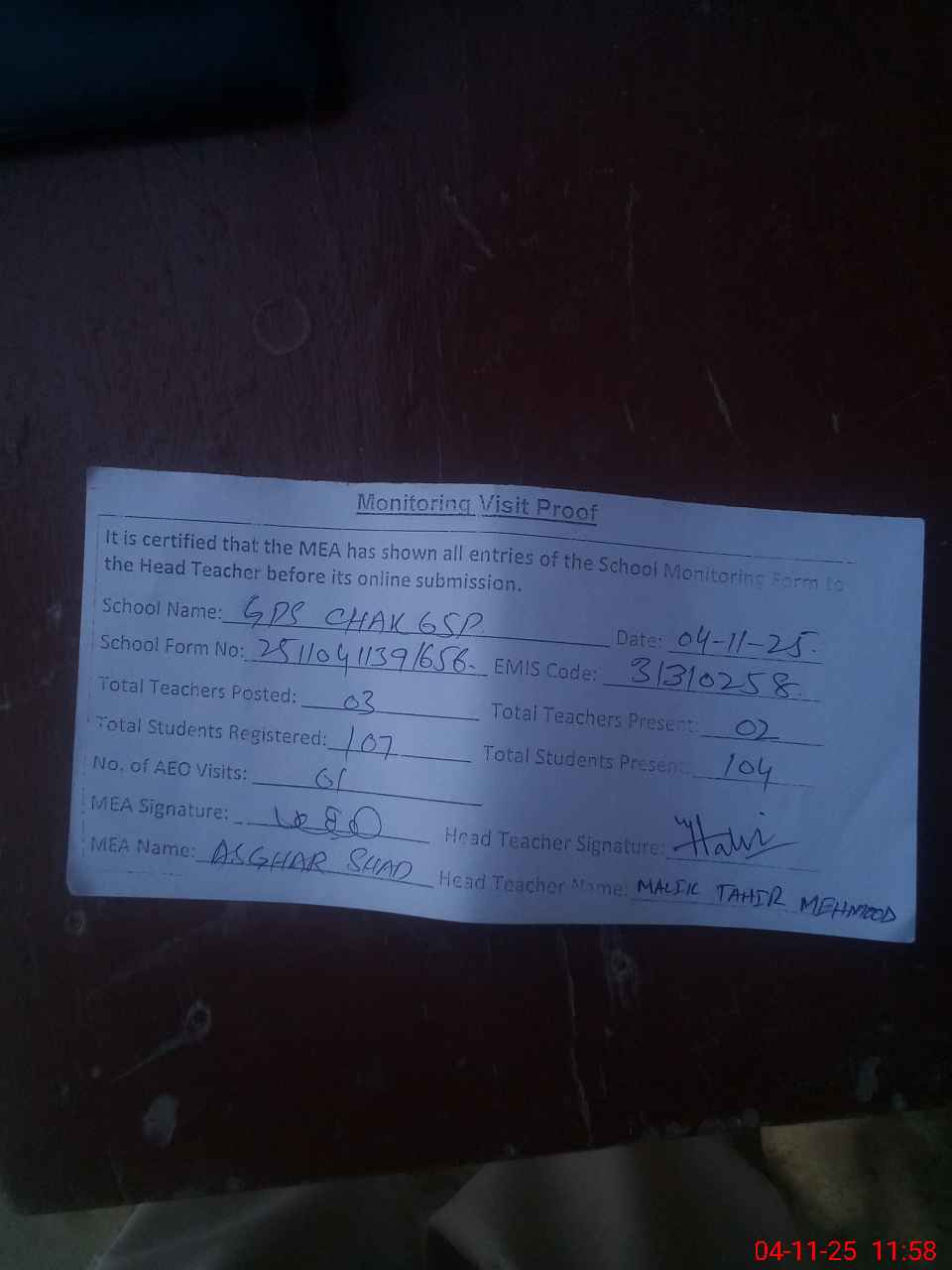 | EMIS Code: 31310258 | Name of School: GPS CHAK NO 65 P | |||
