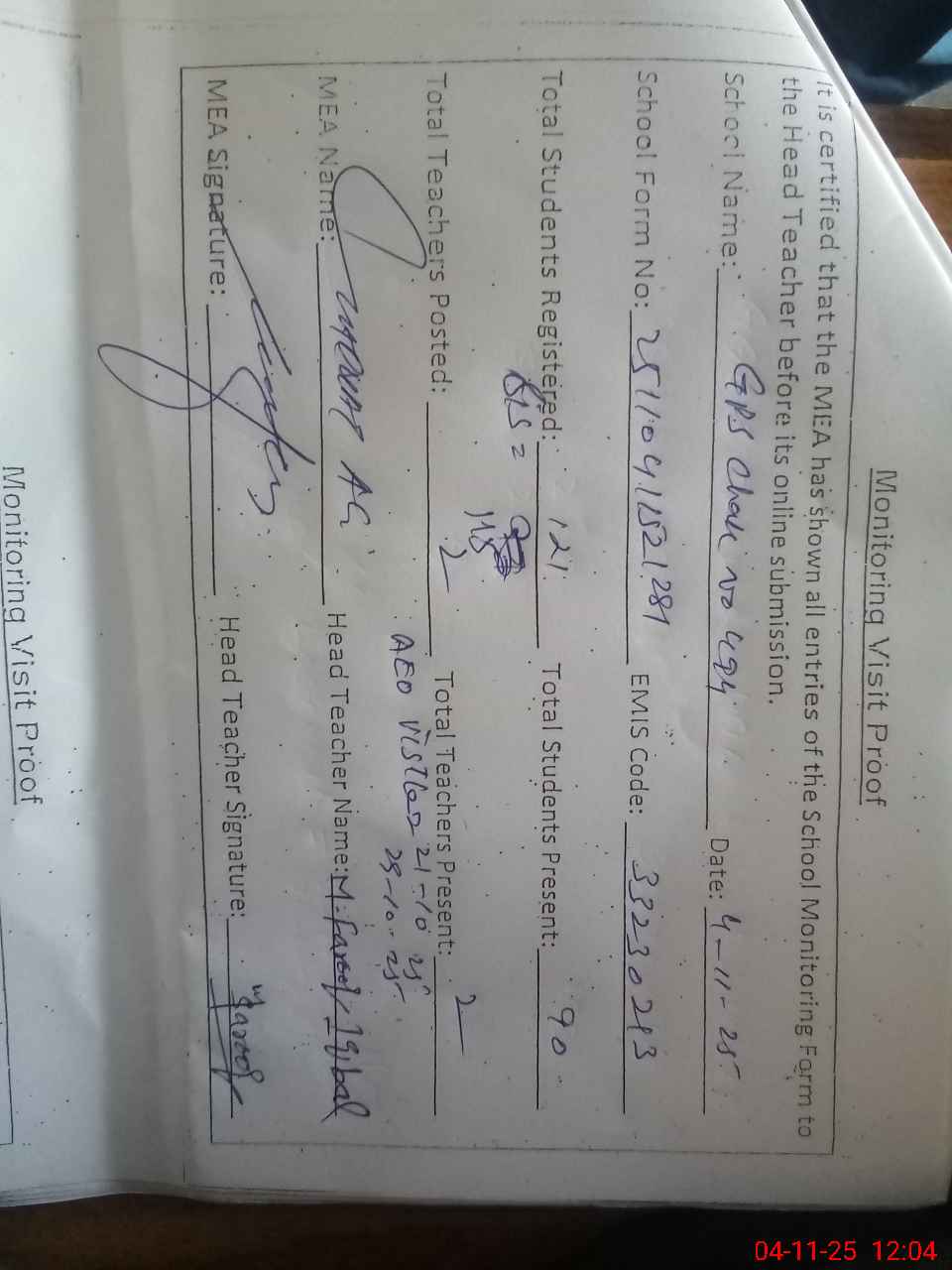 | Attendance Register | Head Teacher | MEA with School | Visit Proof |