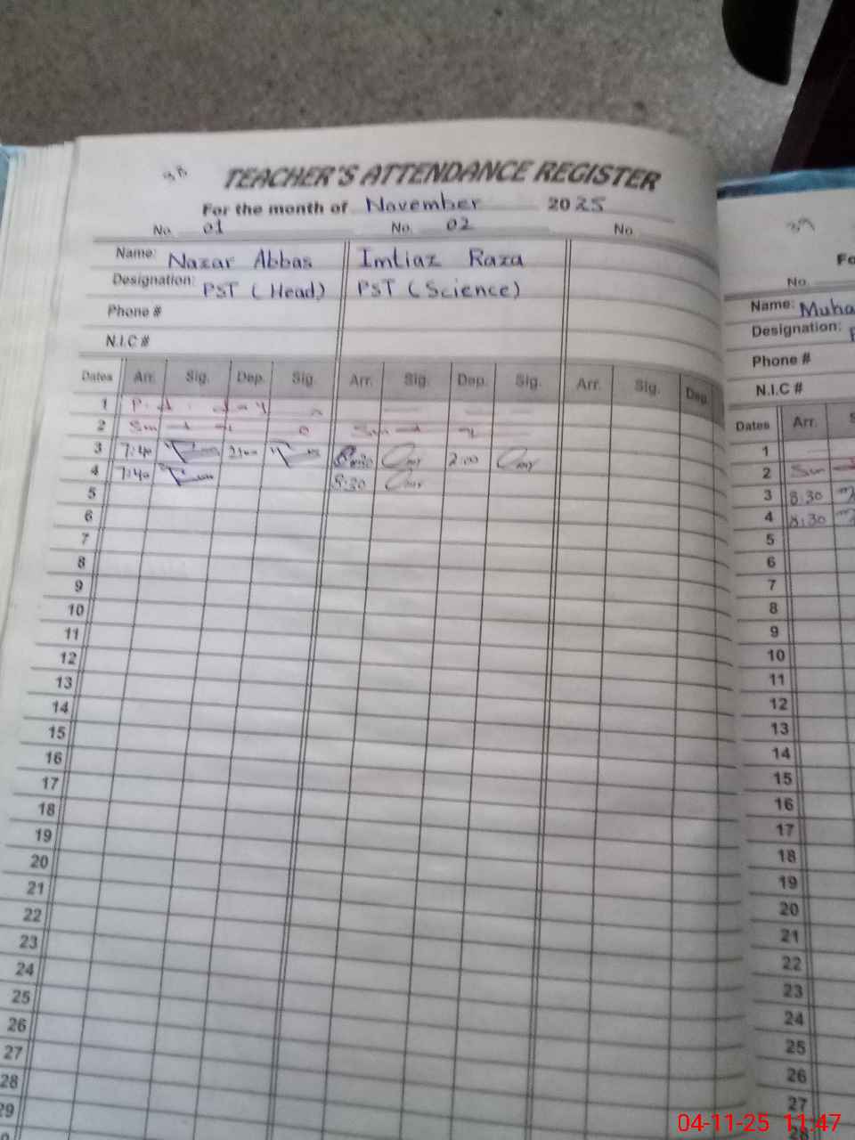 | CNIC | Full Name | Designation | R/C | Absence During Last Calender Month |