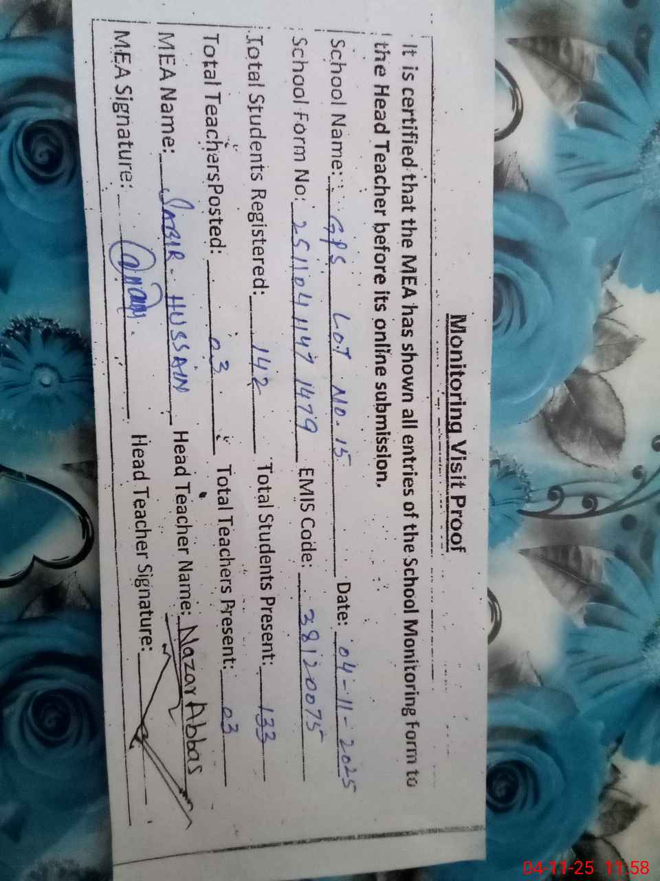 | Attendance Register | Head Teacher | MEA with School | Visit Proof |