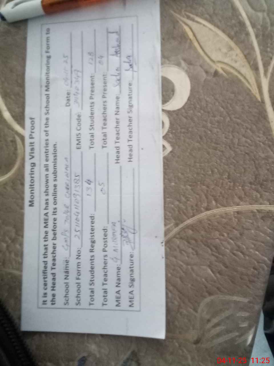 | Attendance Register | Head Teacher | MEA with School | Visit Proof |