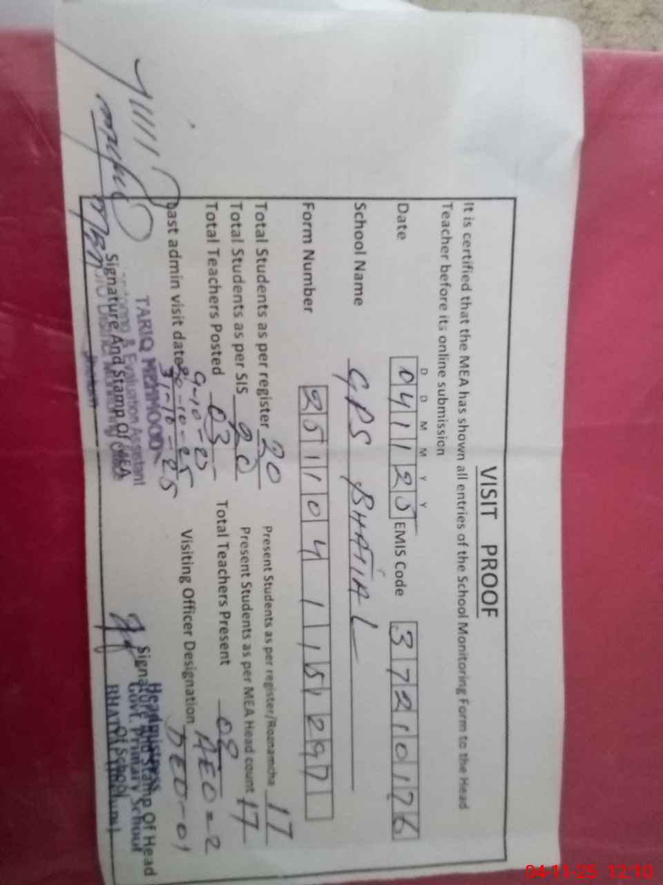 | Attendance Register | Head Teacher | MEA with School | Visit Proof |