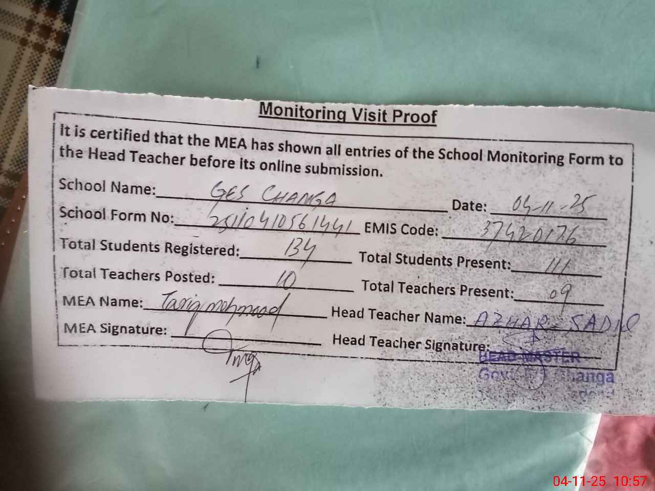 | Attendance Register | Head Teacher | MEA with School | Visit Proof |